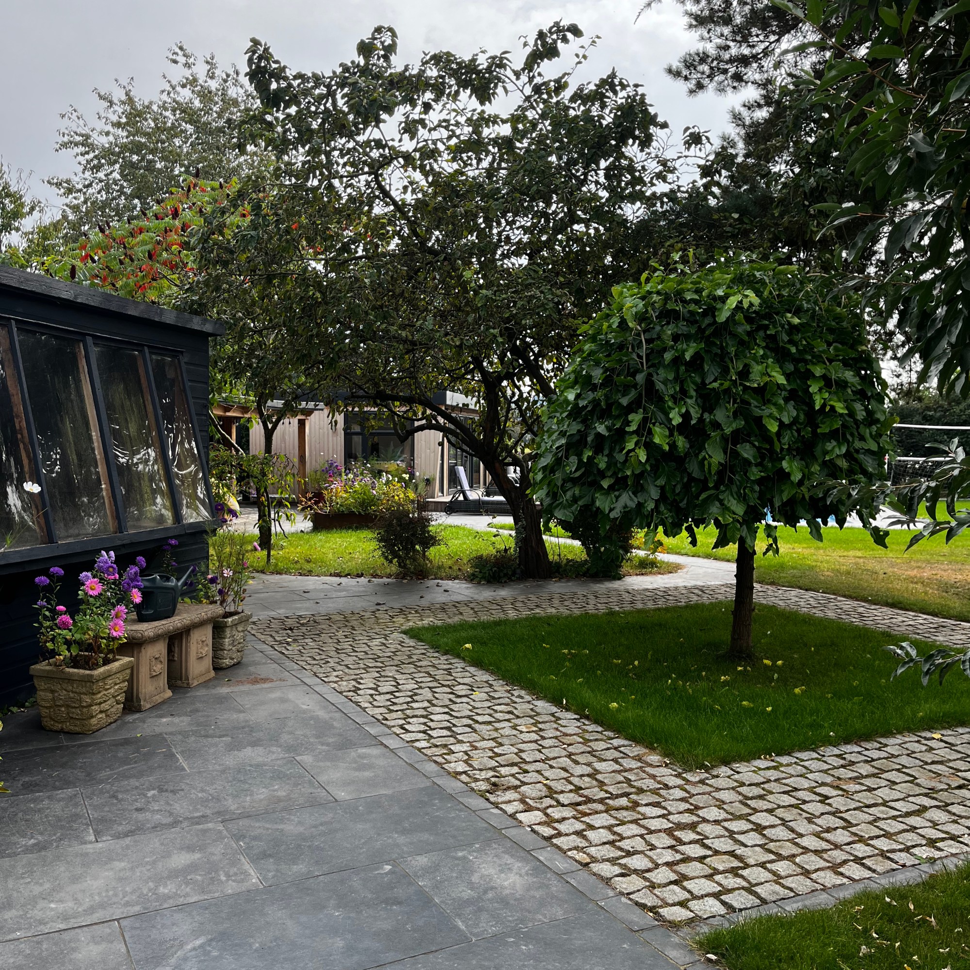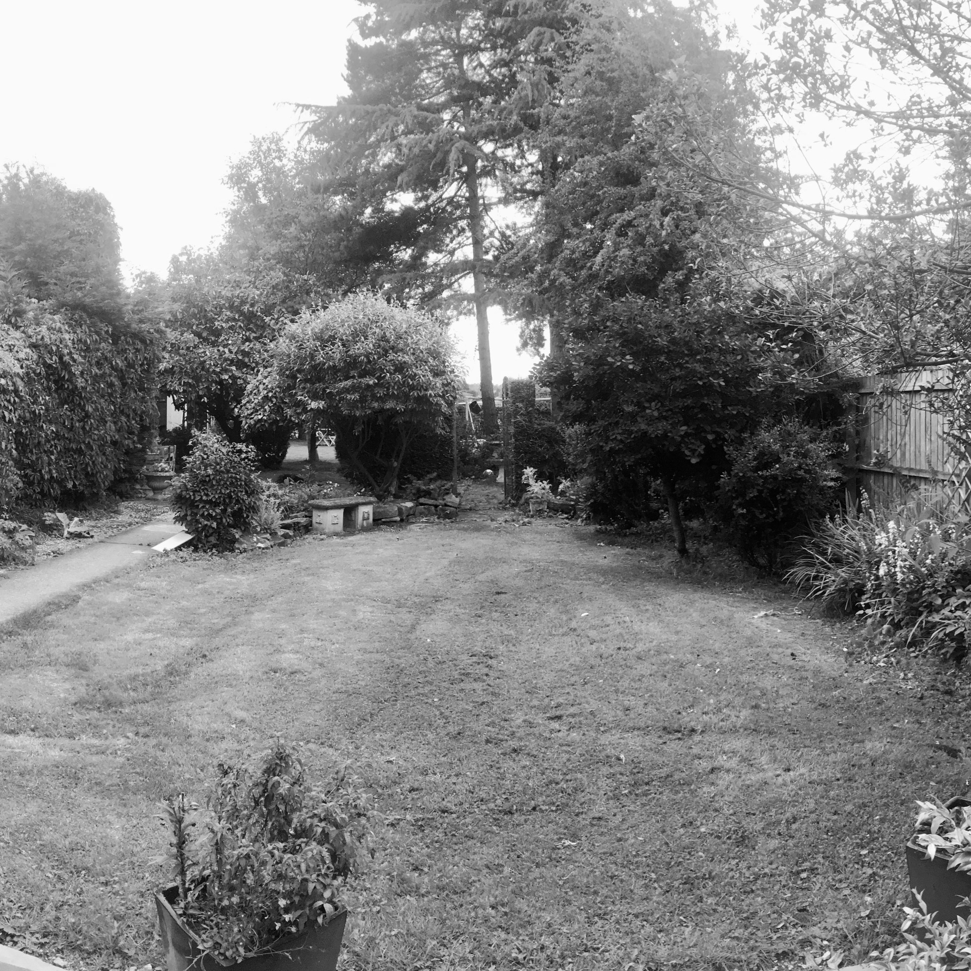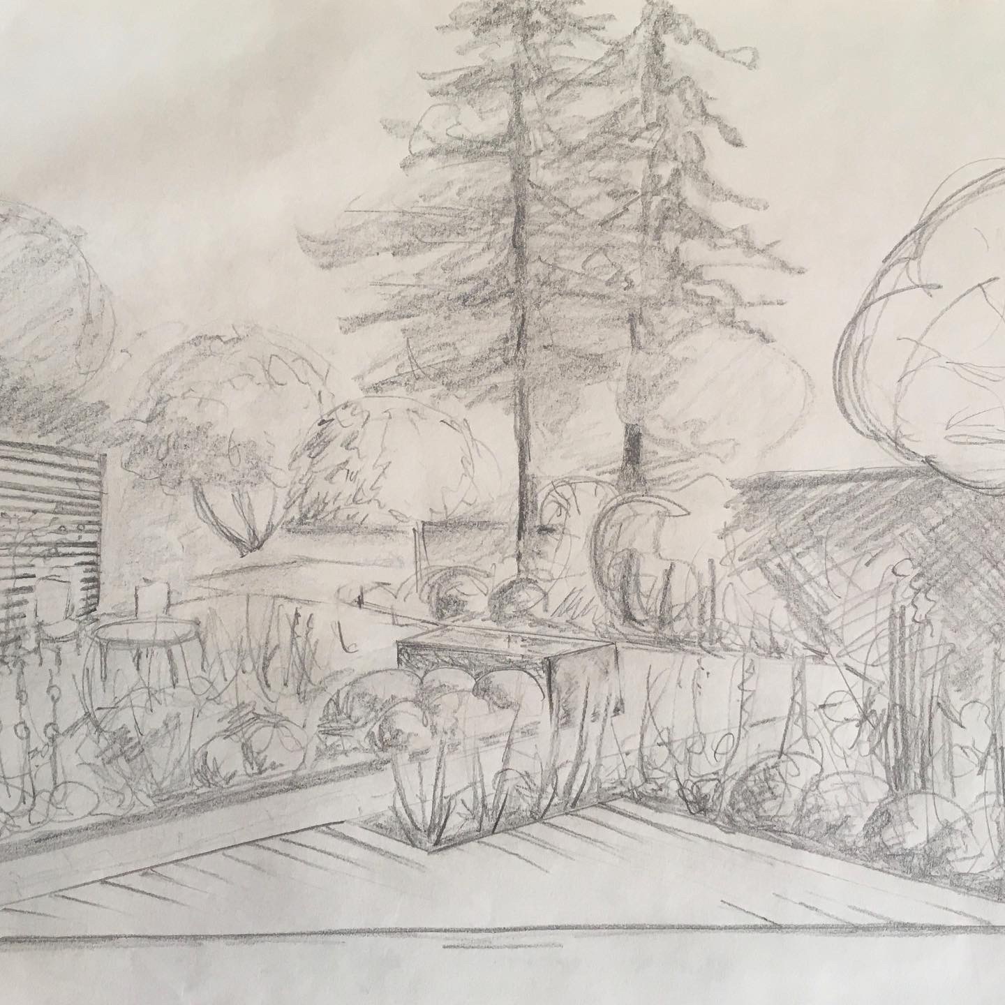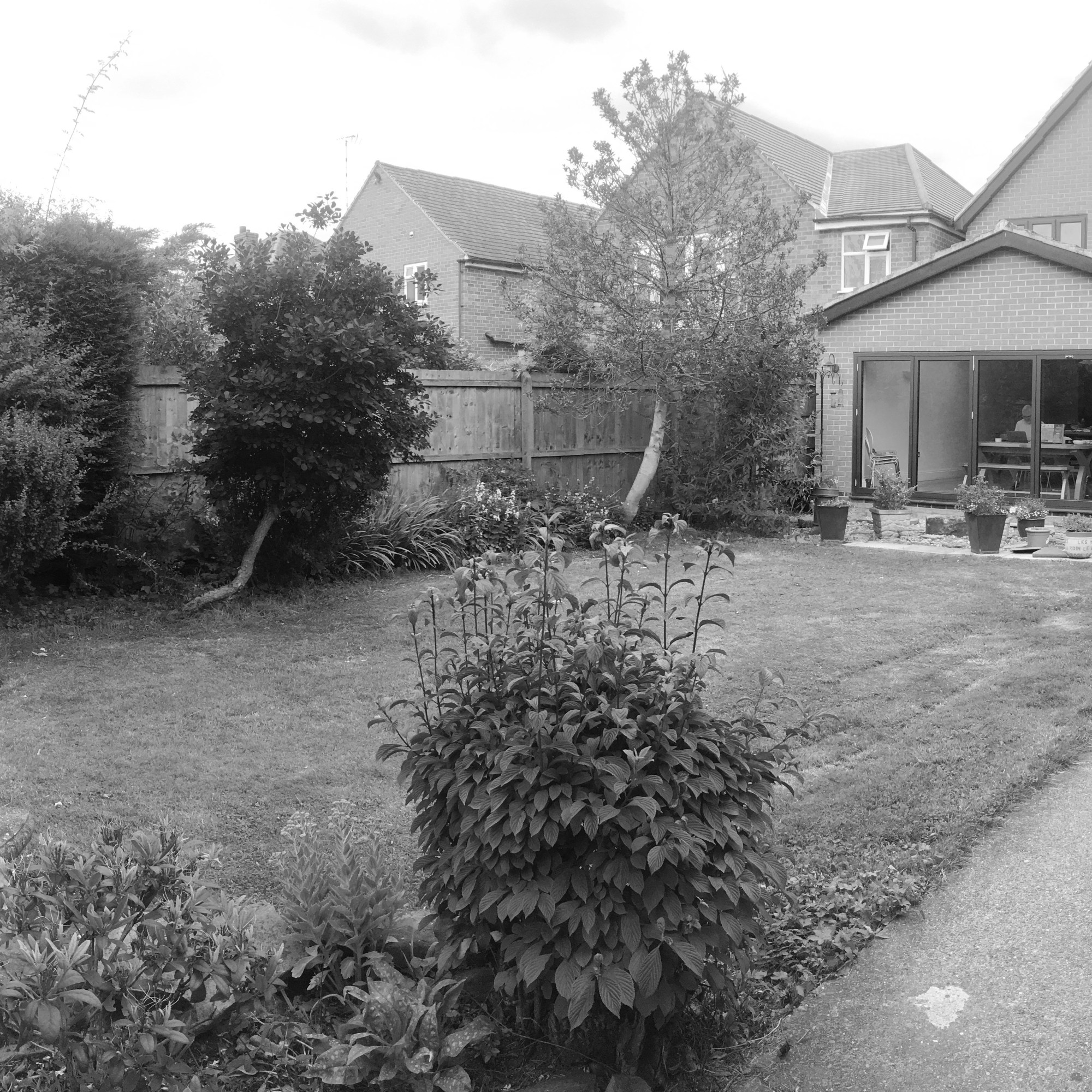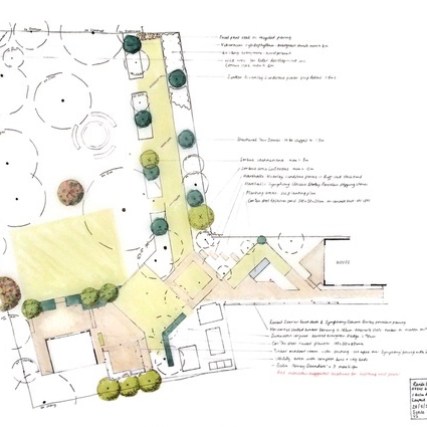 Brief; To provide a focal point from the kitchen, and to link the two garden spaces. New hard landscaping, fencing, garden office and planting. To evaluate which of the existing trees to retain.