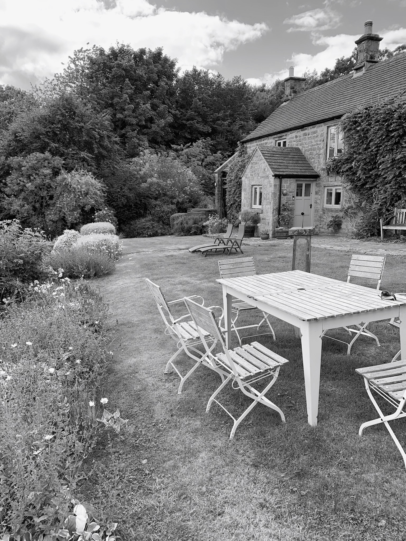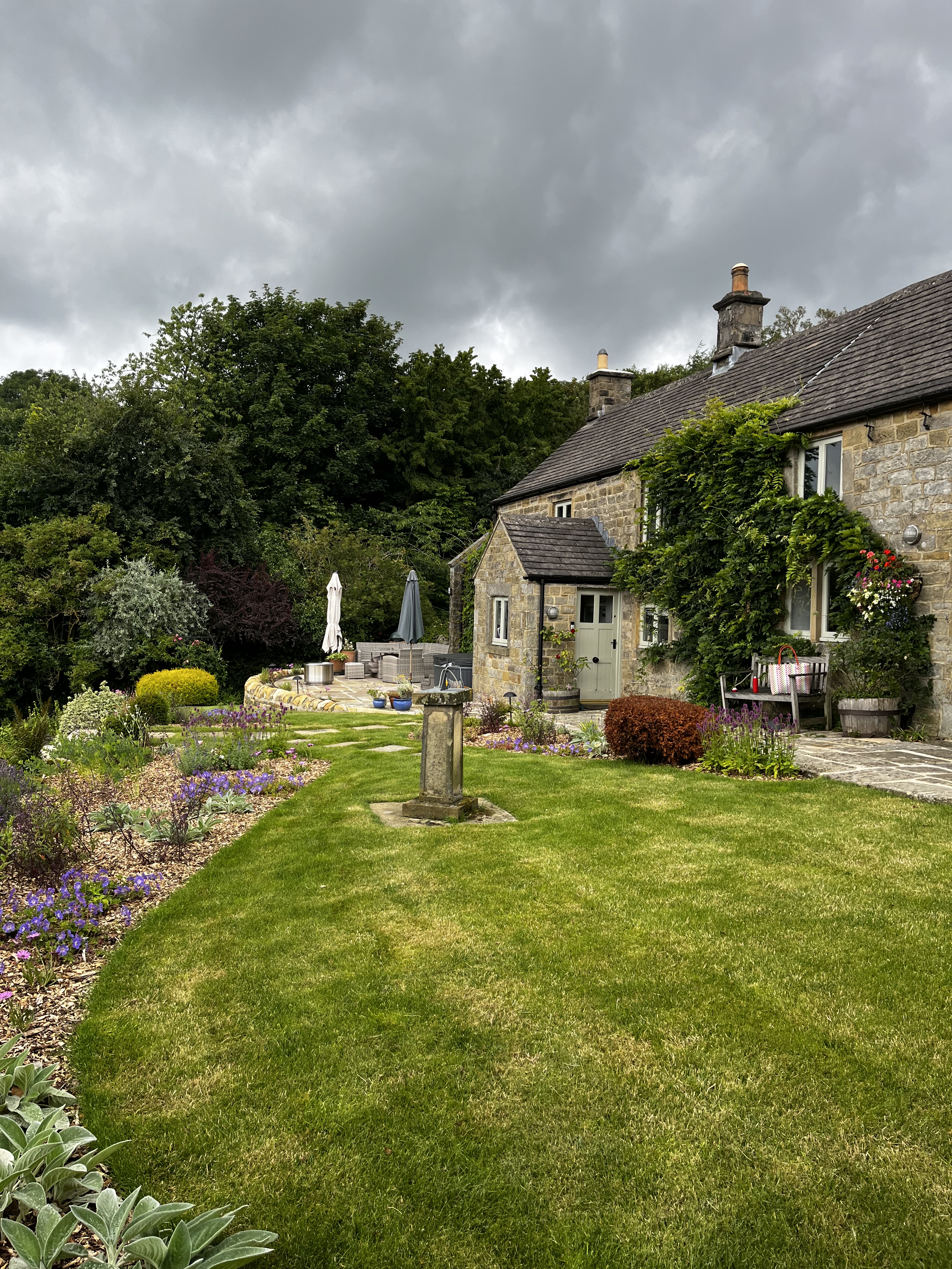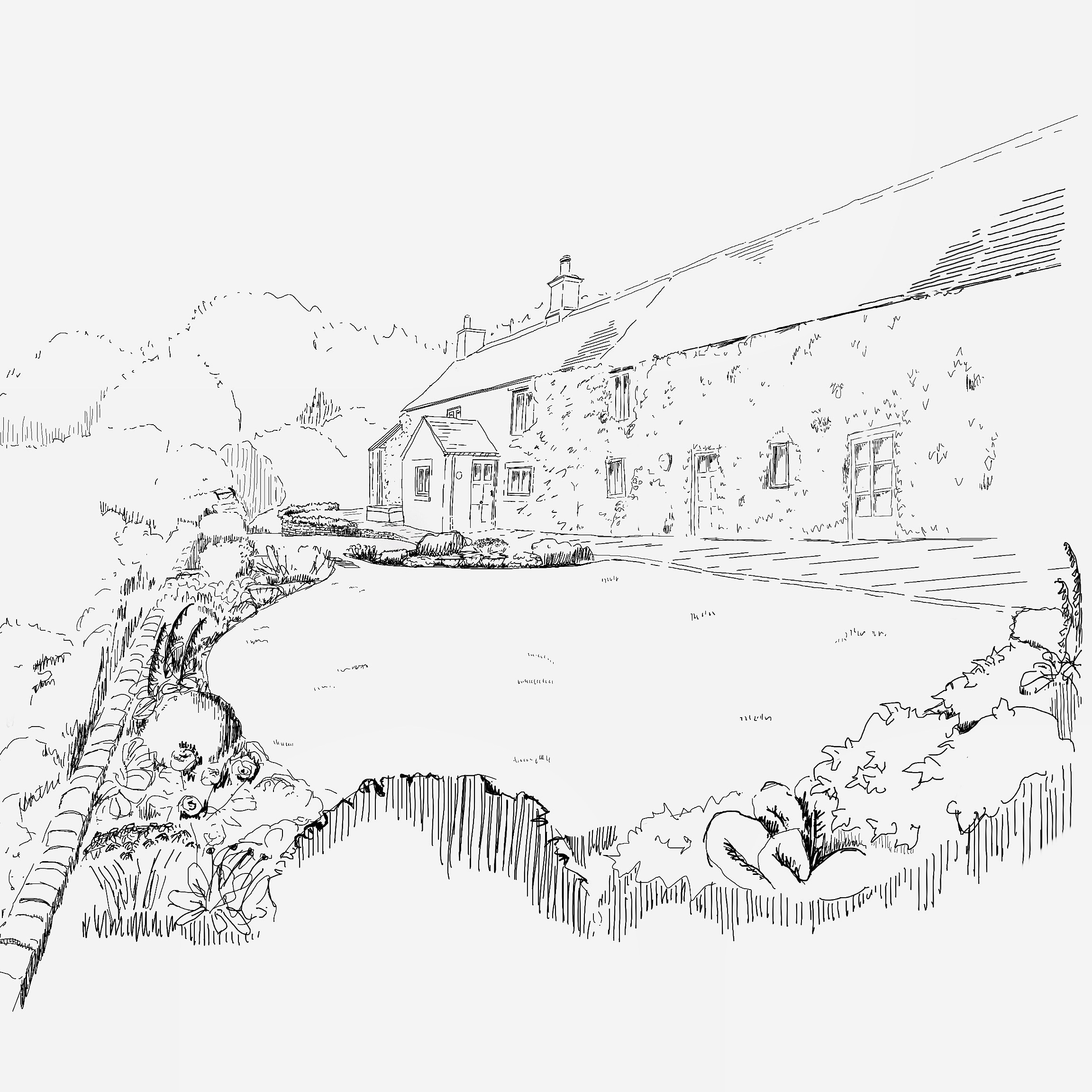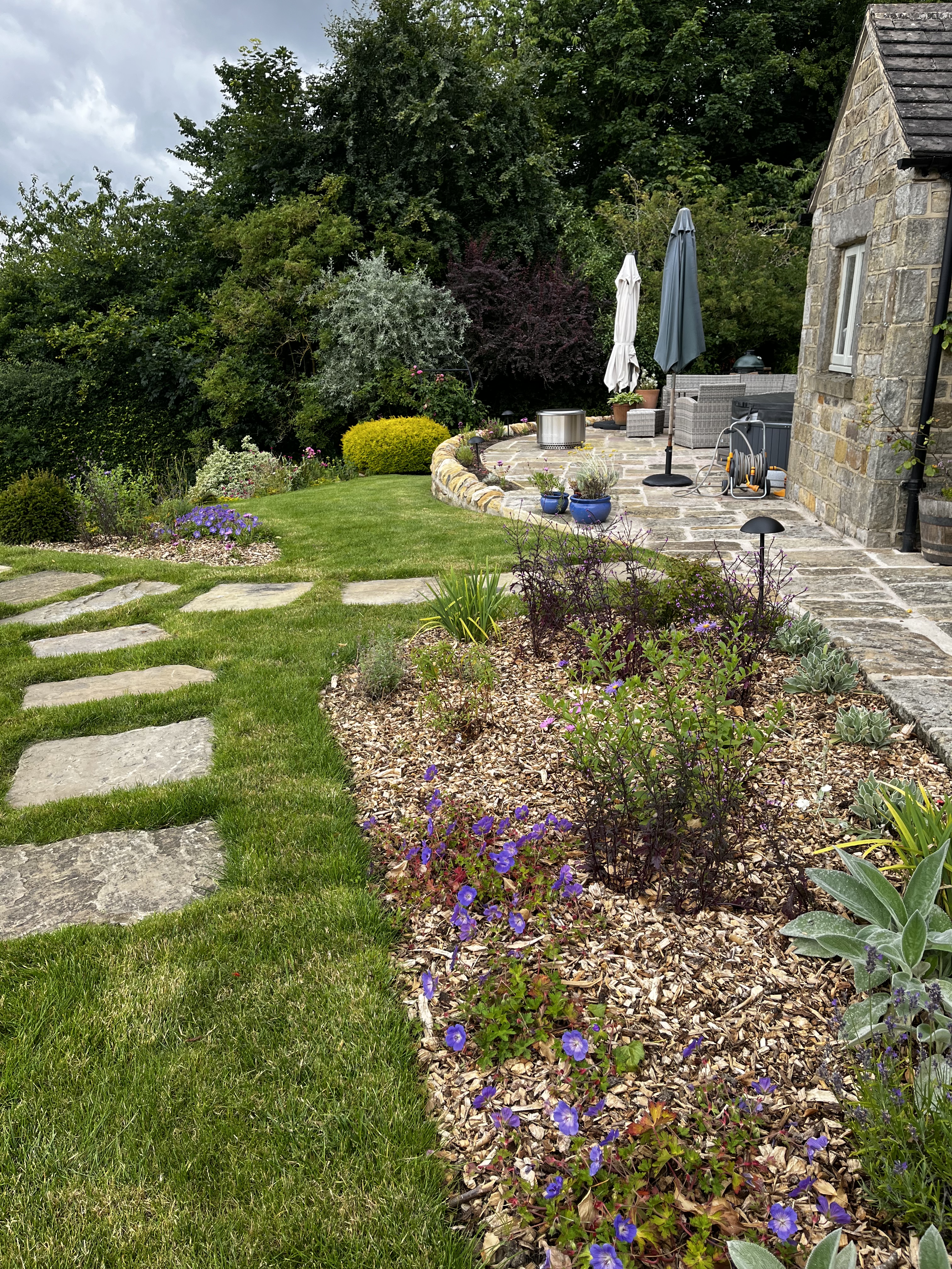 This south facing garden had a rectangular lawn and narrow borders in front of the house. The new design created a sweeping curved terrace for entertaining, stepping stones through the lawn and generous new borders to envelop the house in lush cottage style planting. Locally reclaimed sandstone was carefully sourced to match the existing paving and house.