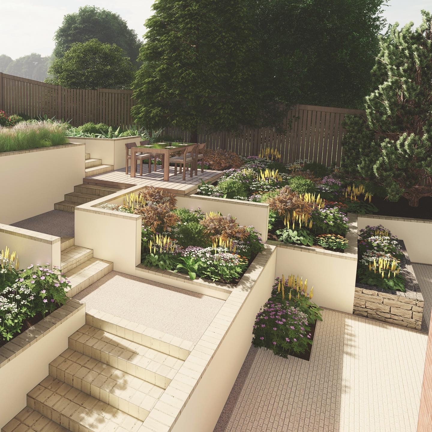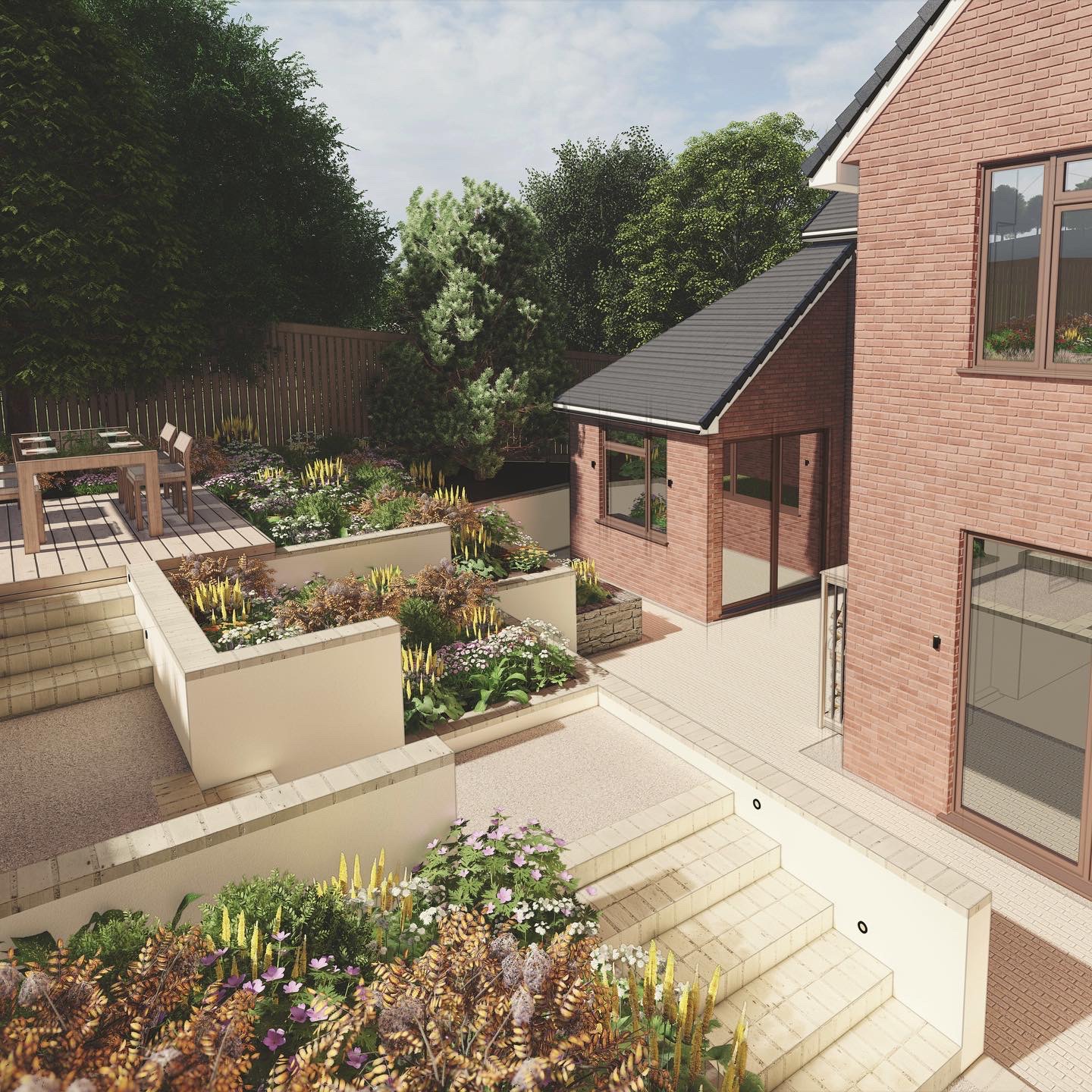 Rendered block walls and pale clay pavers were selected to create a light and airy feel. We presented 3D renders of this design to help communicate the complex levels.