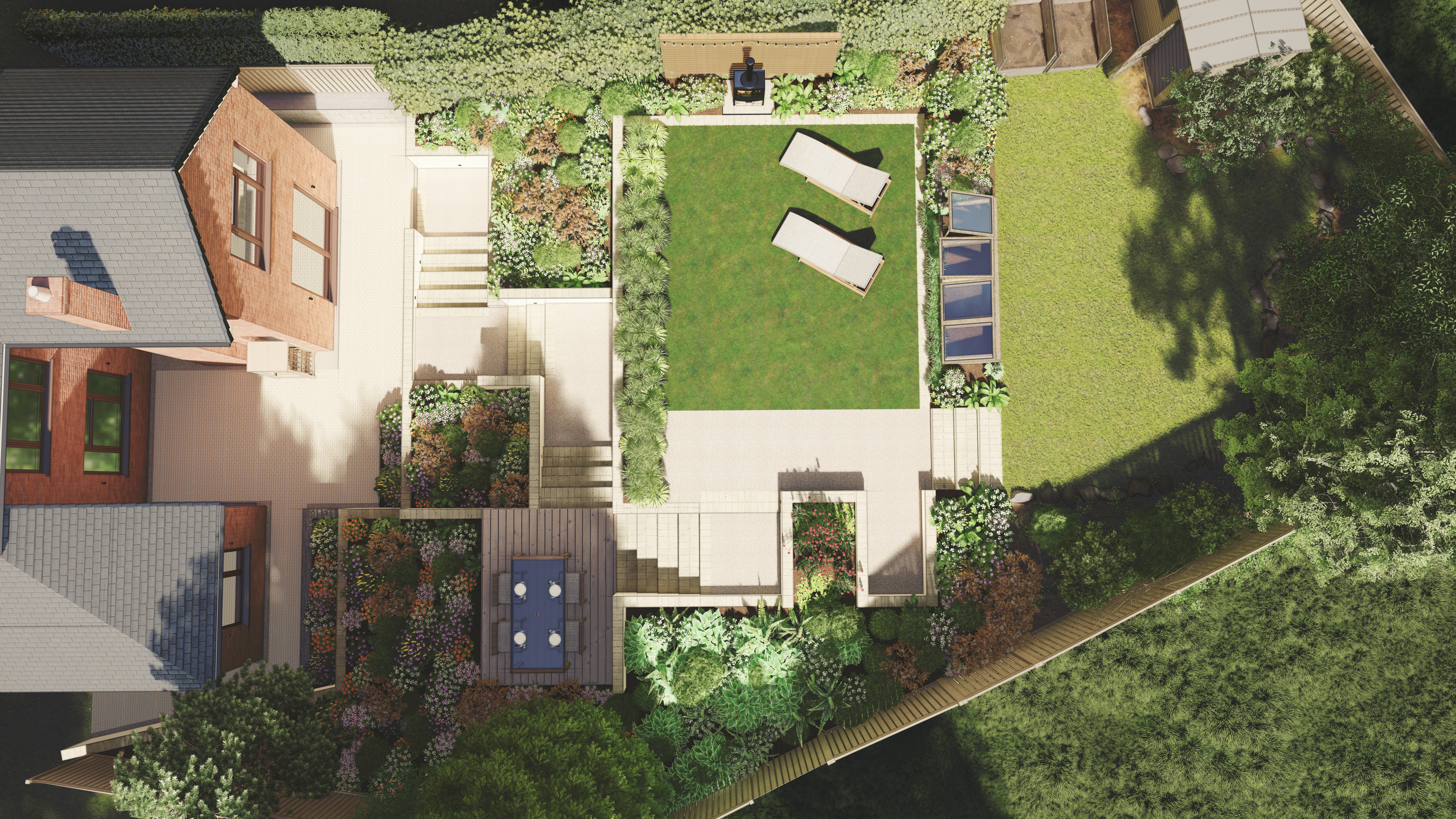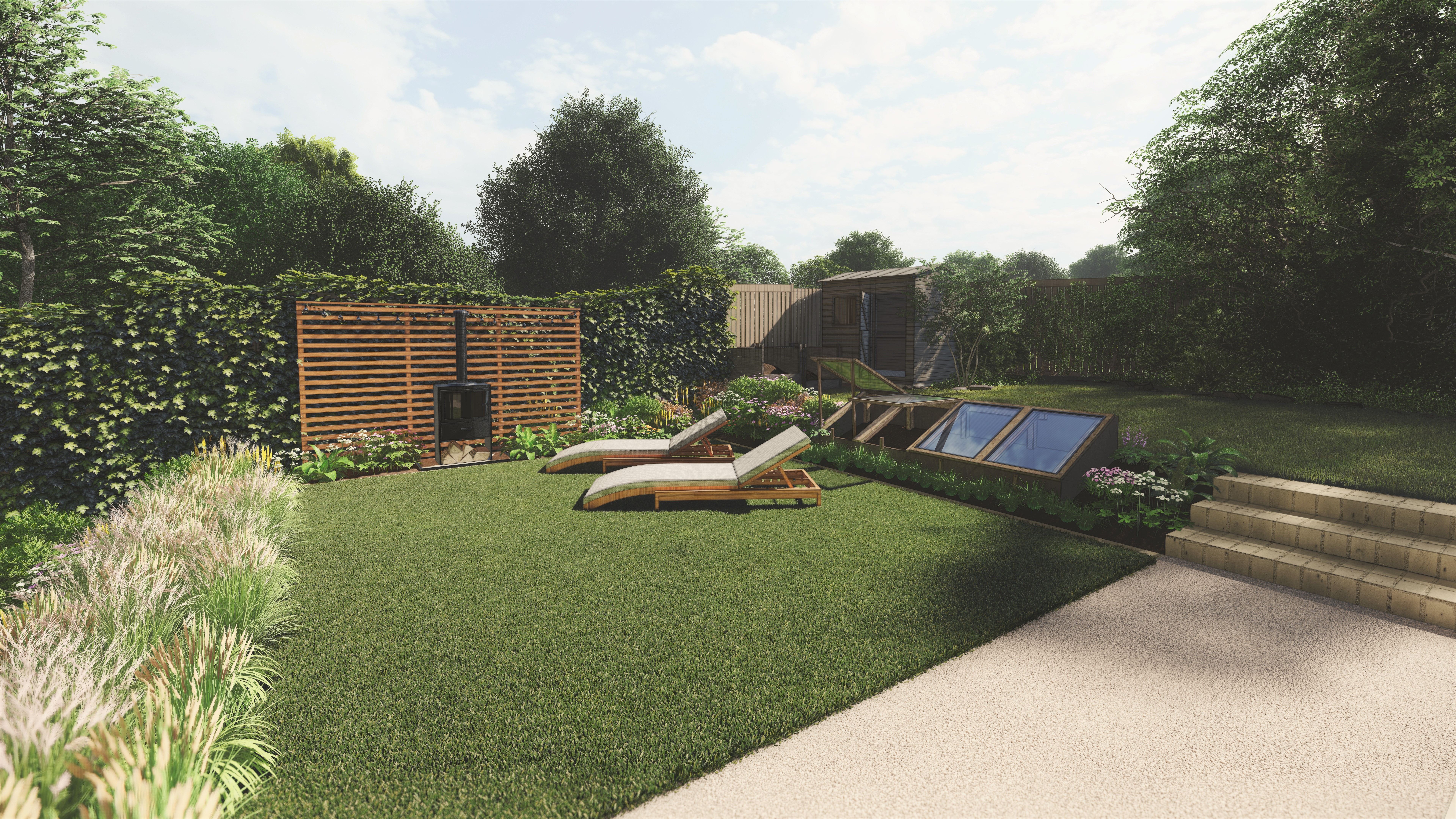 Beyond this is a flexible growing space for fruit bushes and vegetables before finally reaching a secluded ‘woodland’ area for peaceful contemplation.