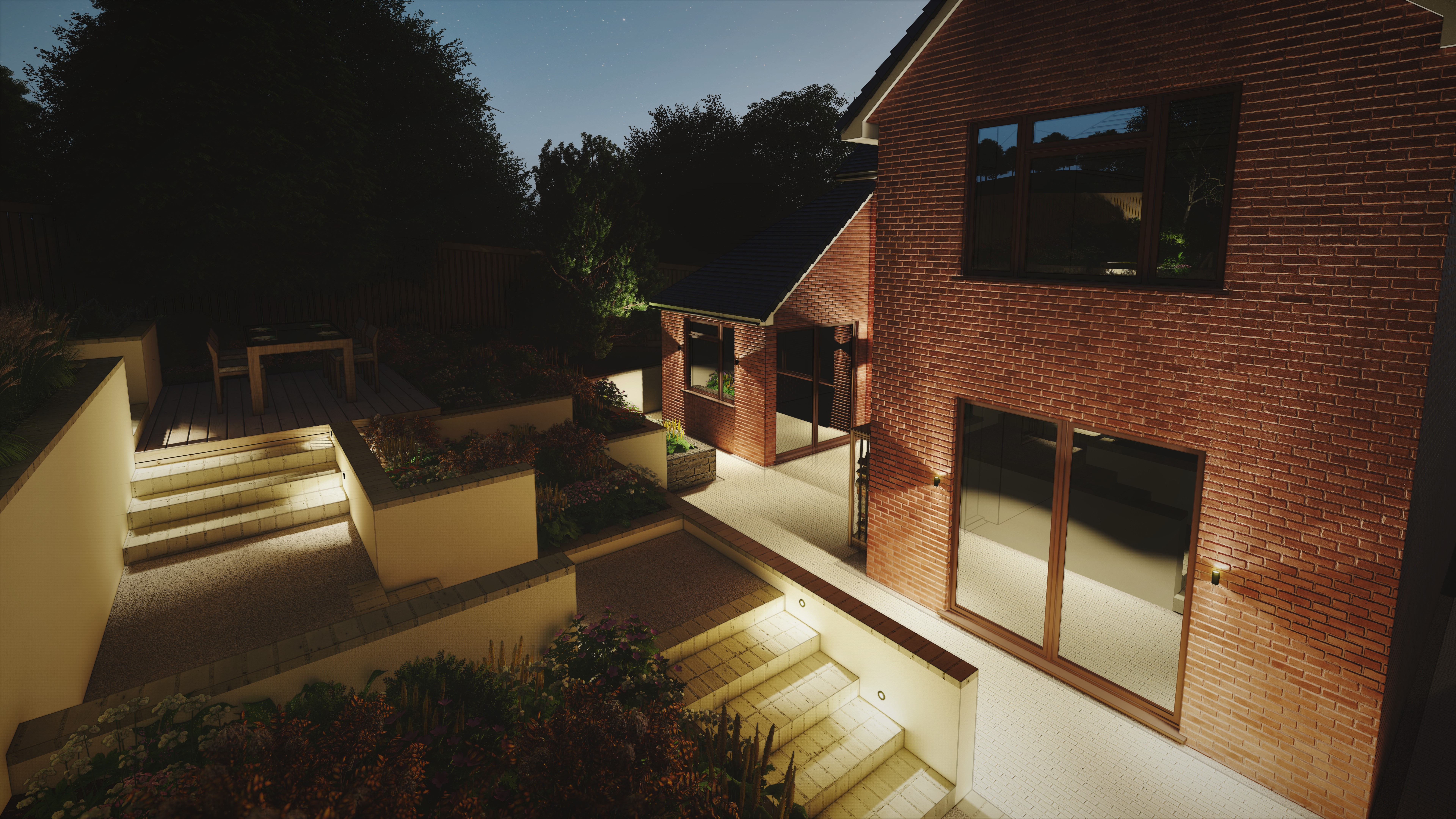 Generous, well lit steps lead to first a cosy seating area with flexibility to house a dining table. Further up the garden is a large lawn area which will allow the family to entertain friends around a fire place.