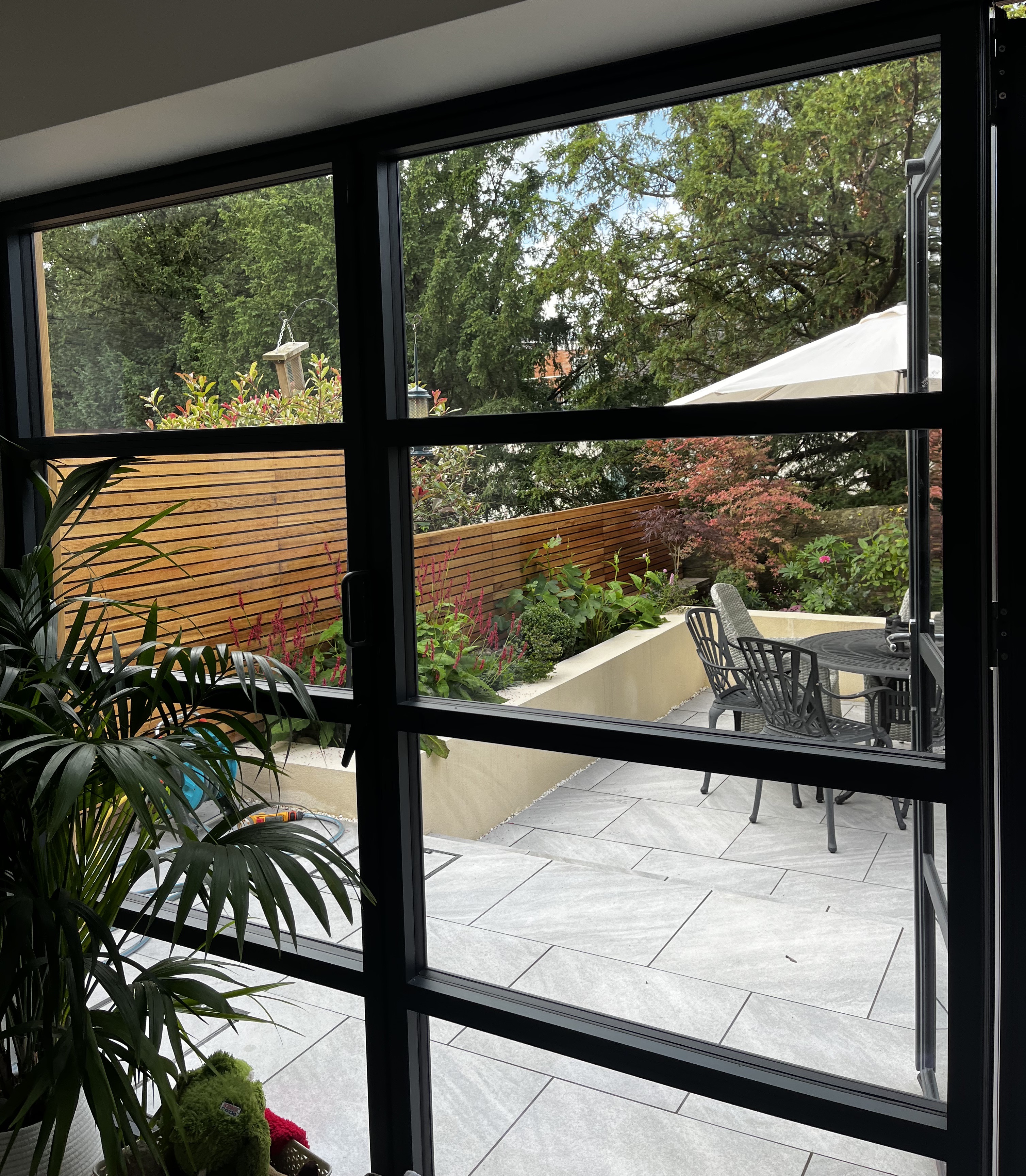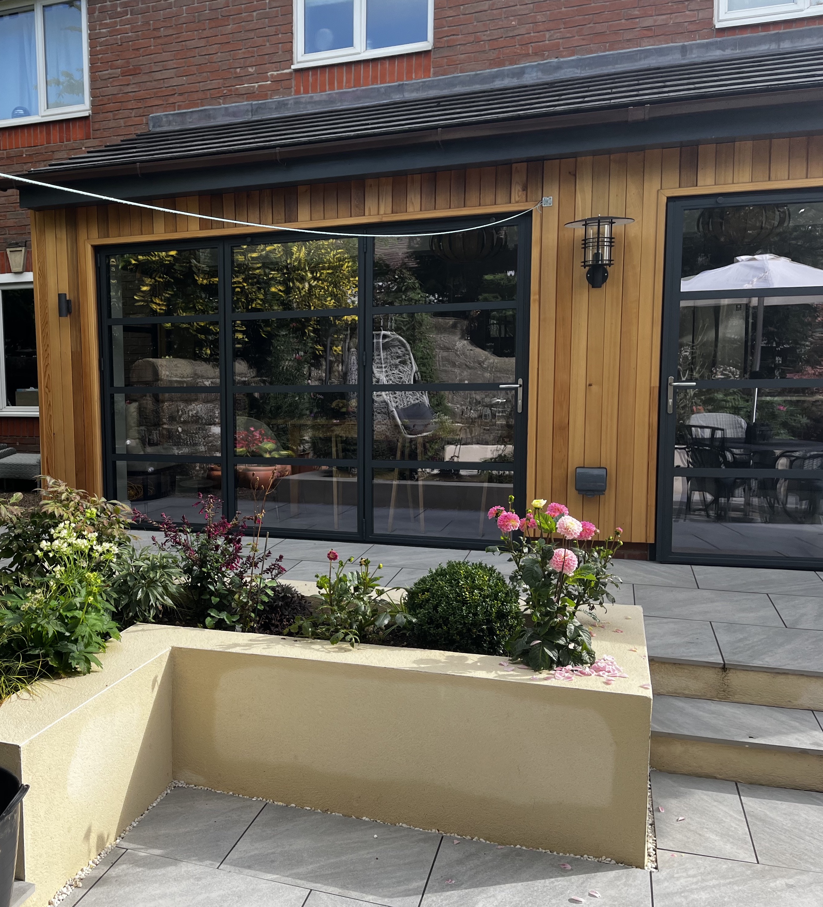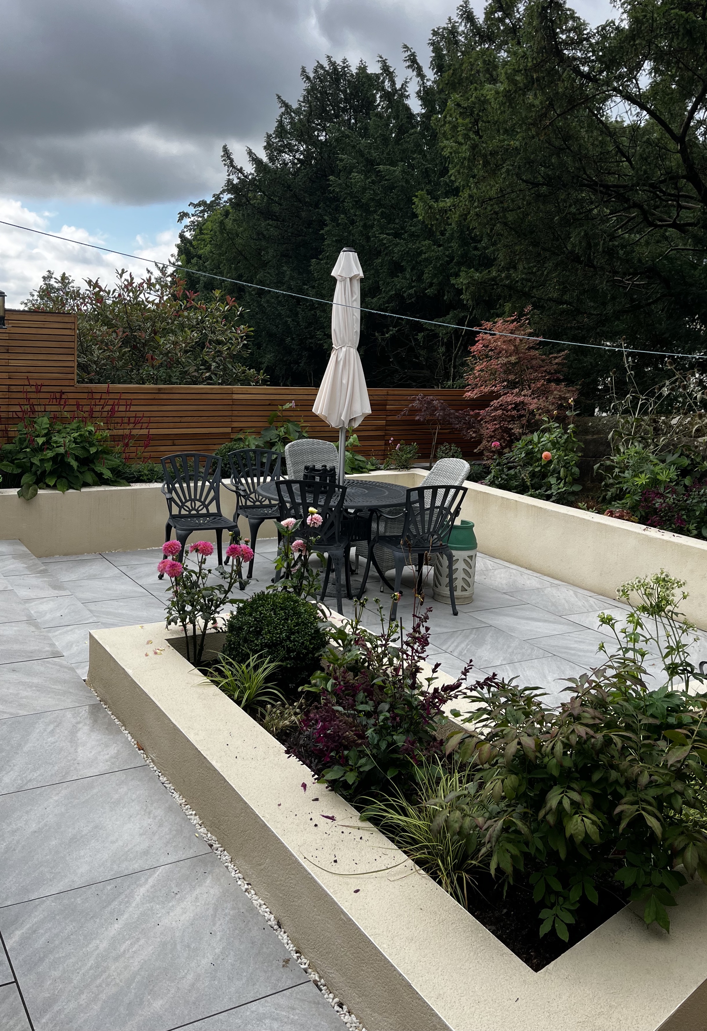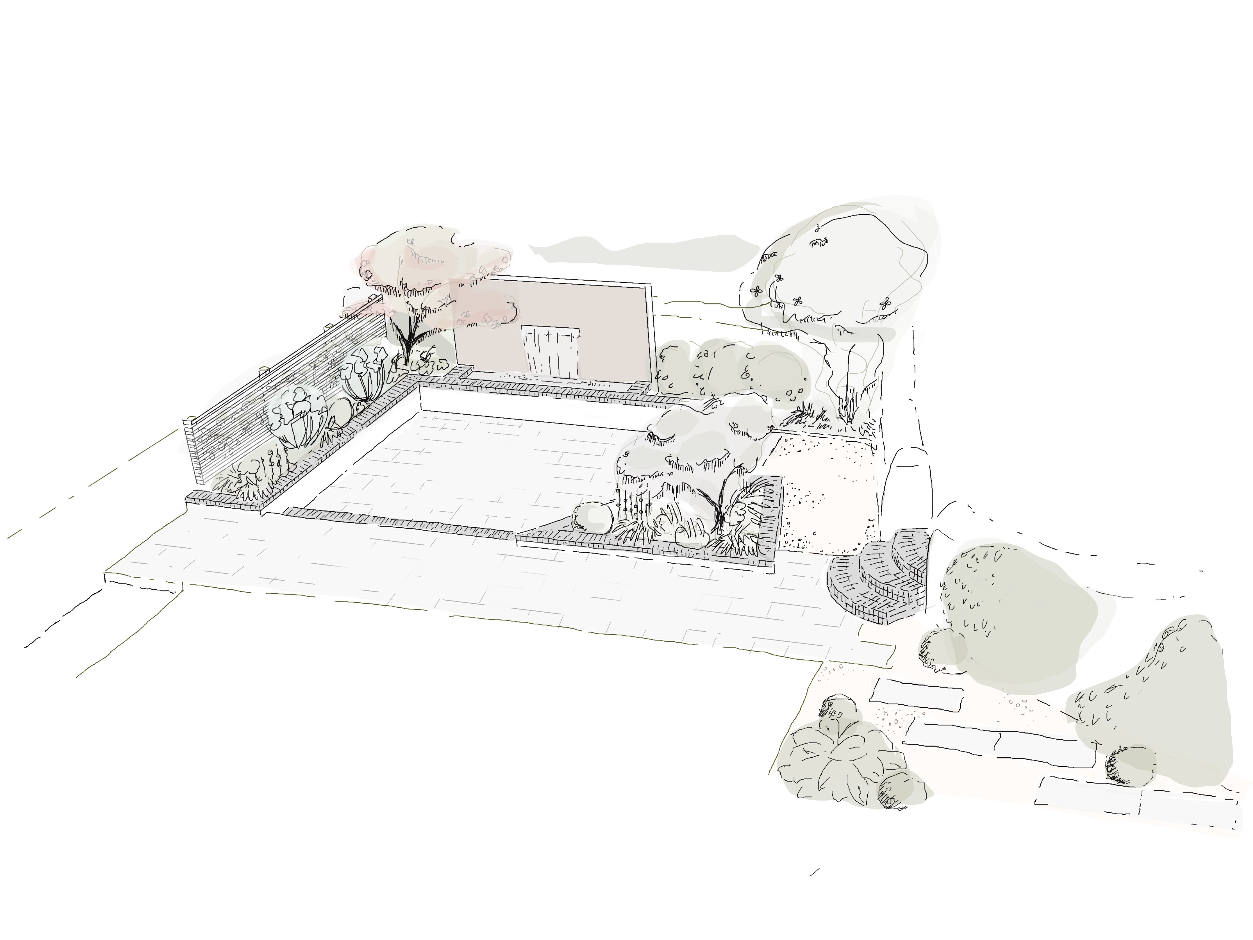This garden needed a new layout following a new kitchen extension, The client wanted it to flow on from the kitchen with the same flooring. The design organised the space to bring some planting close to the internal dining area, and dedicate a smart ‘garden room’ for relaxing and entertaining.