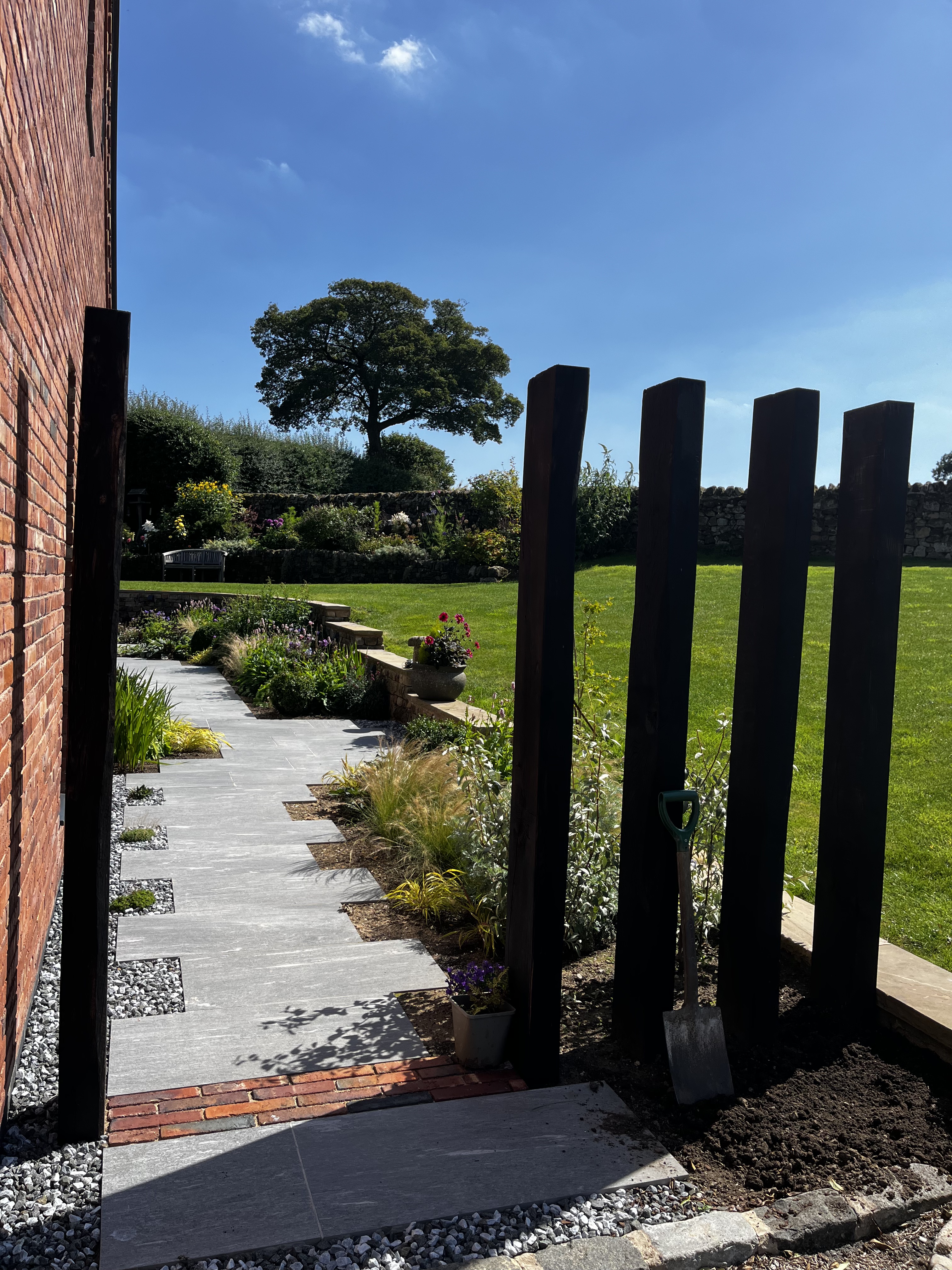 Phase 2 on this clients property included a design to wrap around the rear of the new house – we created a series of charred screens to provide a sense of privacy and to lead from the driveway to the back door. The design included planting chosen for all year round interest.
