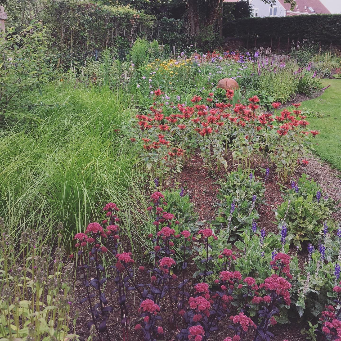 A large scale planting scheme designed to provide food and habitat for birds, bees and insects and look beautiful throughout the year in this front garden.